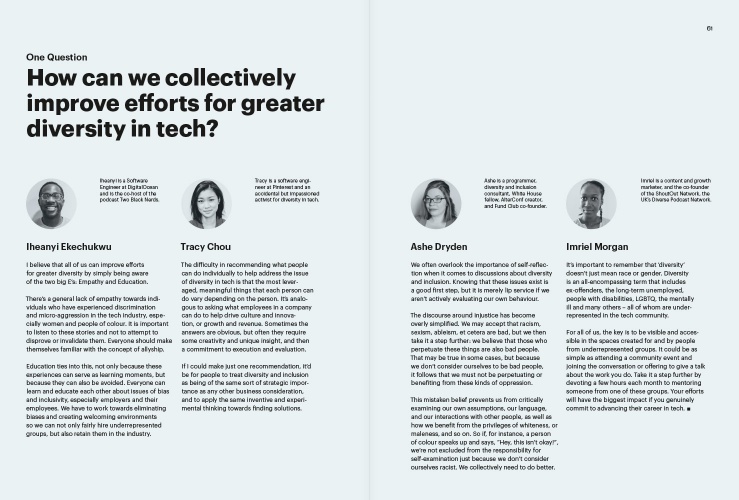 We asked Ashe Dryden, Iheanyi Ekechukwu, Imriel Morgan and Tracy Chou how we can collectively improve diversity efforts in our industry.
